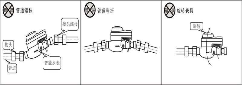 將表接頭套入接頭螺母后安裝到管道上,然后扭轉(zhuǎn)接頭螺母將水表安裝到管道上,保持水表讀數(shù)度盤水平向上,水表與管道連接時(shí)不應(yīng)受過(guò)大的折彎力,以免損壞水表接口斷裂。禁止出現(xiàn)如下圖所示的安裝方式: